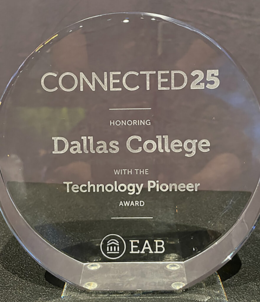 Dallas College has been named a national leader in student success innovation, earning EAB’s Technology Pioneer Award at the company’s Connected25 conference in Orlando, Florida.